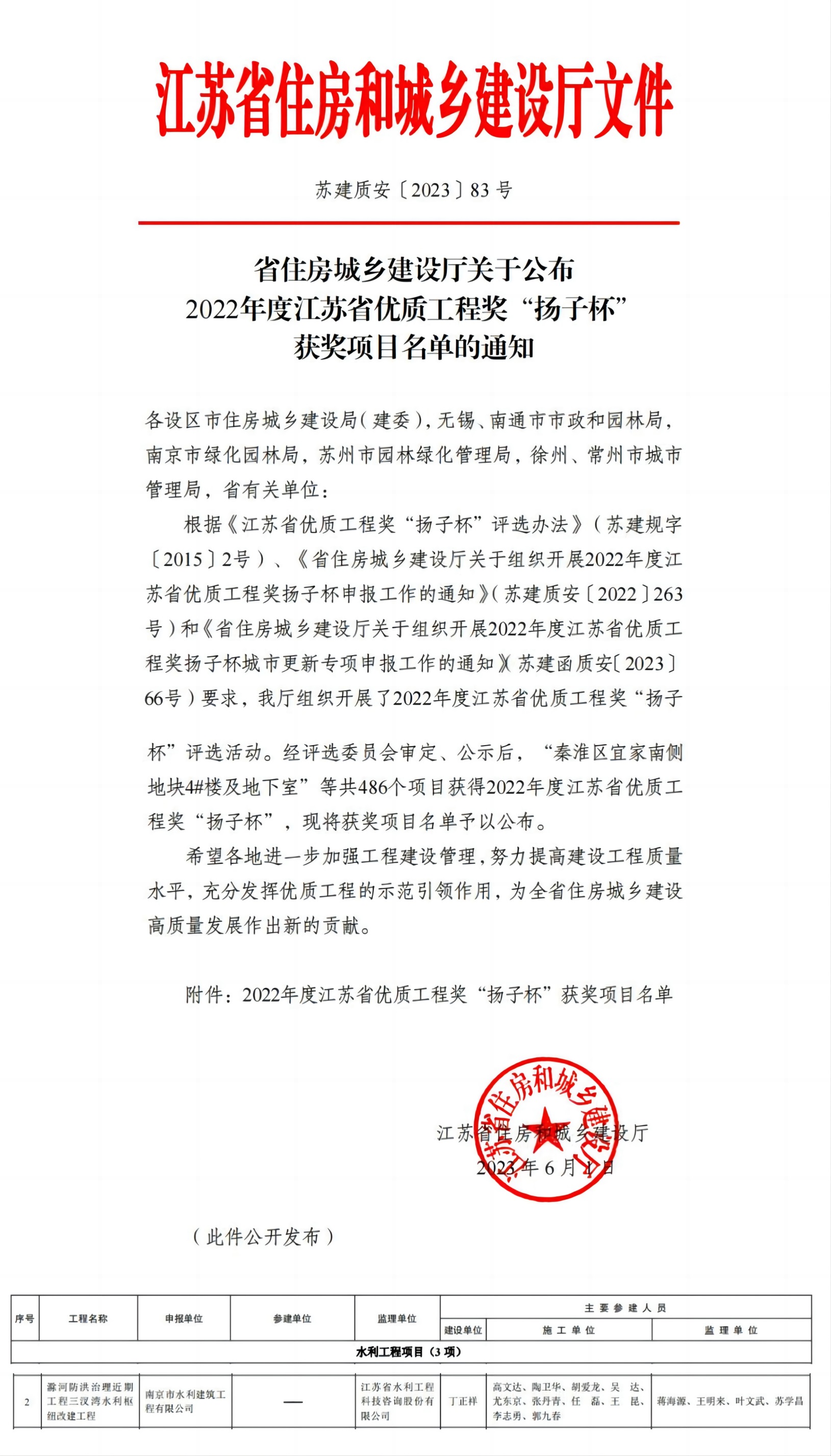近日,根據(jù)江蘇省住房和城鄉(xiāng)建設廳發(fā)布的《省住房城鄉(xiāng)建設廳關于公布2022年度江蘇省優(yōu)質工程獎“揚子杯”獲獎項目名單的通知》(蘇建質安〔2023〕83號),由我公司監(jiān)理的滁河防洪治理近期工程三汊灣水利樞紐改建工程榮獲2022年度江蘇省優(yōu)質工程獎“揚子杯”稱號。 滁河防洪治理近期工程三汊灣水利樞紐改建工程位于南京市六合區(qū)龍池街道滁河主河道上,滁河主河道上,滁河流域系長江下游左岸一級支流。工程概算總投資7596.05萬元。2012年12月1日開工,2014年1月10日完工。該工程由船閘、節(jié)制閘兩部分組成。主要建設內容有拆除重建節(jié)制閘,設計流量為400m3/s,節(jié)制閘共3孔,每孔凈寬12m;拆建船閘上、下閘首及控制室,船閘最低通航水位6.2m,最高通航水位8.5m;拆除重建上下游翼墻及下閘首交通橋;更換上下游閘閥門、液壓啟閉機及電氣設備;移址新建閘管所;改建三汊灣水文站。 "揚子杯"是江蘇省建設工程質量最高榮譽獎,每年評審一次,代表著省內當前工程建設質量的最高水平。