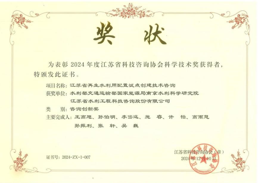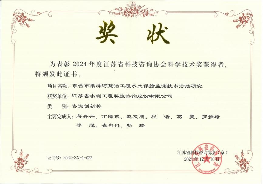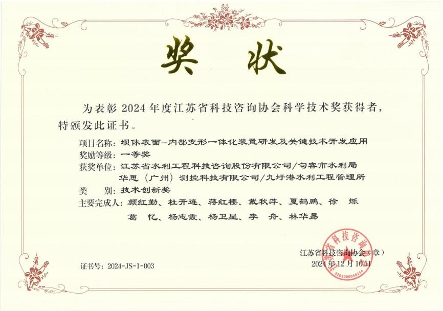 根據(jù)蘇咨協(xié)字〔2024〕19號(hào)《關(guān)于2024年度江蘇省科技咨詢協(xié)會(huì)科學(xué)技術(shù)獎(jiǎng)勵(lì)的決定》,由我公司主持完成的《壩體表面-內(nèi)部變形一體化裝置研發(fā)及關(guān)鍵技術(shù)開發(fā)應(yīng)用》獲2024年度江蘇省科技咨詢協(xié)會(huì)科學(xué)技術(shù)獎(jiǎng)技術(shù)創(chuàng)新一等獎(jiǎng),公司主持完成的《東臺(tái)市梁垛河整治工程水土保持監(jiān)測(cè)技術(shù)方法研究》及參與完成的《江蘇省再生水利用配置試點(diǎn)創(chuàng)建技術(shù)咨詢》二項(xiàng)成果榮獲咨詢創(chuàng)新獎(jiǎng)。    公司高度重視科技創(chuàng)新工作,通過科技人才培養(yǎng)、科技自主立項(xiàng)等措施,促進(jìn)公司各學(xué)科均衡發(fā)展,推動(dòng)全公司科技創(chuàng)新能力提高,優(yōu)秀科技成果數(shù)量穩(wěn)步增長,為江蘇科技創(chuàng)新事業(yè)發(fā)展貢獻(xiàn)力量。 (供稿:研發(fā)中心 夏鶴鵬)