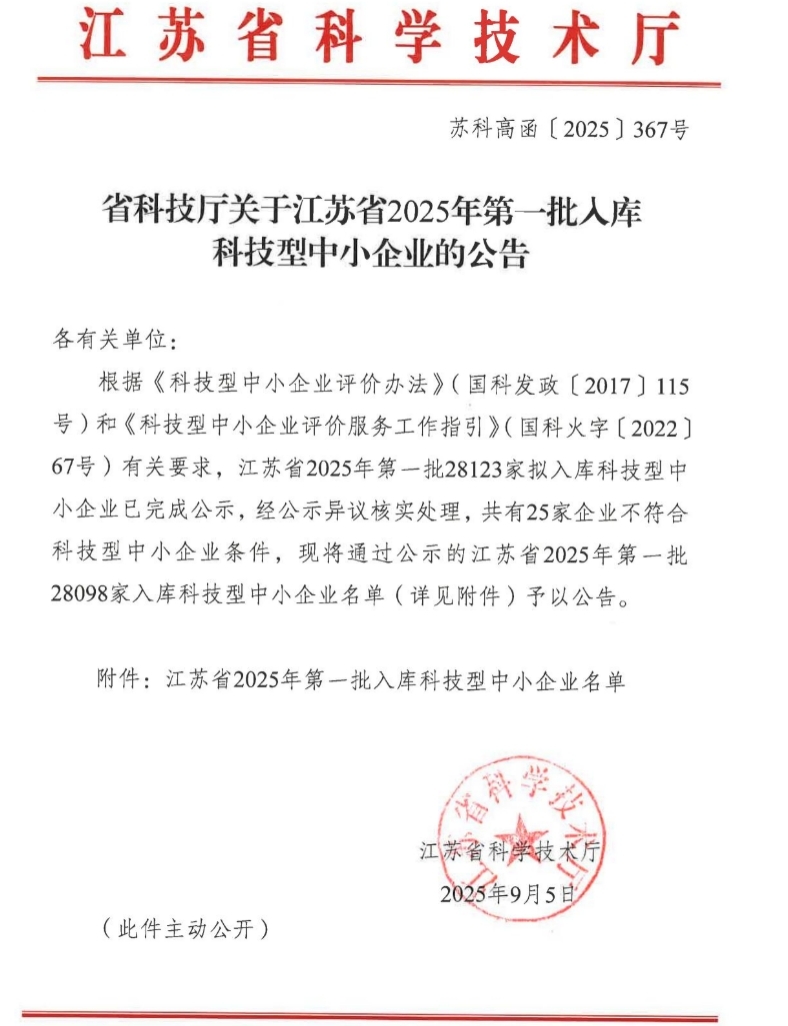 根據(jù)《省科技廳關(guān)于江蘇省2025年第一批入庫科技型中小企業(yè)的公告》(蘇科高函〔2025〕367號),我公司組織申報的2025年度全國科技型中小企業(yè)成功通過認定!