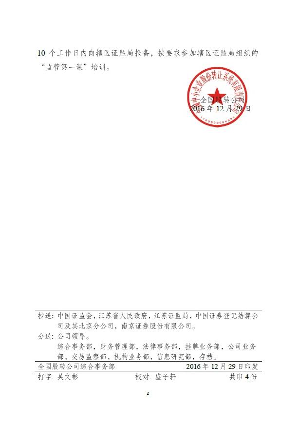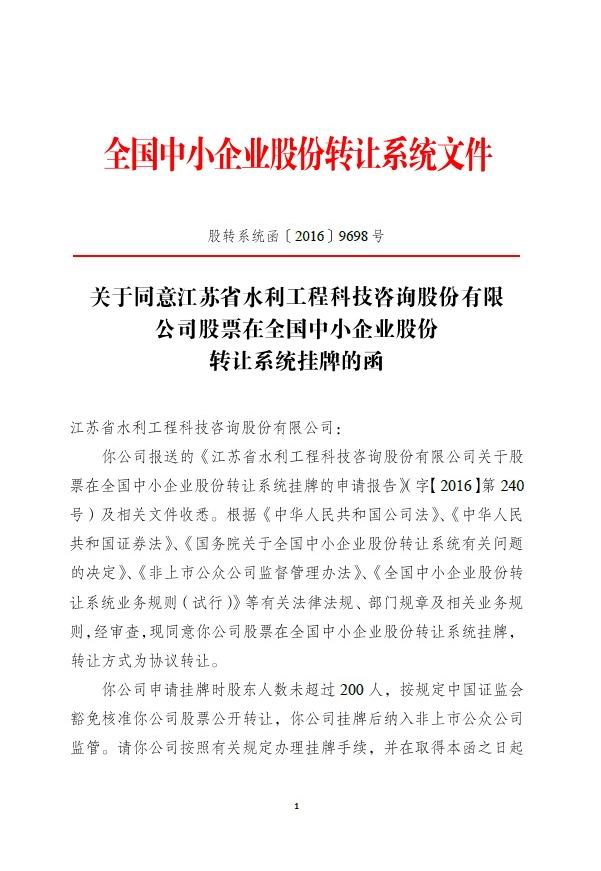 2016年12月29日,我公司正式收到全國中小企業(yè)股份轉(zhuǎn)讓系統(tǒng)的復(fù)函,同意掛牌上市。 全國中小企業(yè)股轉(zhuǎn)系統(tǒng)公告顯示,江蘇省水利工程科技咨詢股份有限公司(證券簡稱:水利咨詢 證券代碼:870619)的掛牌申請獲得批準(zhǔn)。本次掛牌上市的主辦券商為南京證券,法律顧問為北京大成(南京)律師事務(wù)所,財(cái)務(wù)審計(jì)為亞太(集團(tuán))會(huì)計(jì)師事務(wù)所(特殊普通合伙)。 本次掛牌新三板,為公司更快、更好發(fā)展增加了強(qiáng)大動(dòng)力,具有非常重要的意義。接下來,我們會(huì)抓住江蘇水利改革發(fā)展的新機(jī)遇,深化改革,開拓創(chuàng)新,為公司的發(fā)展壯大而繼續(xù)努力。