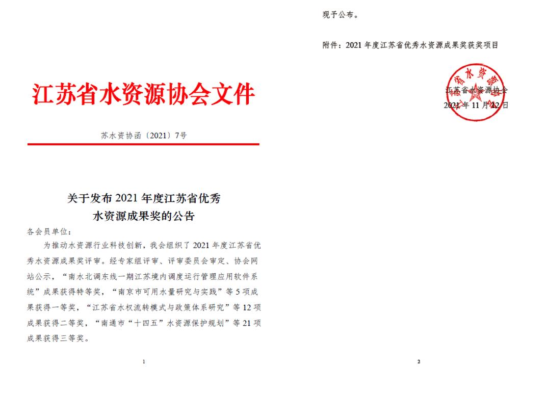 近日,“2021年度江蘇省優(yōu)秀水資源成果獎”揭曉,我司成果豐碩。我司編制的《秦淮河流域水量分配方案》、《江蘇省河湖庫人工生態(tài)環(huán)境補水分析研究》分別榮獲一等獎、二等獎,公司參與的《江蘇省里下河腹部地區(qū)河湖生態(tài)水位確定報告》獲一等獎。