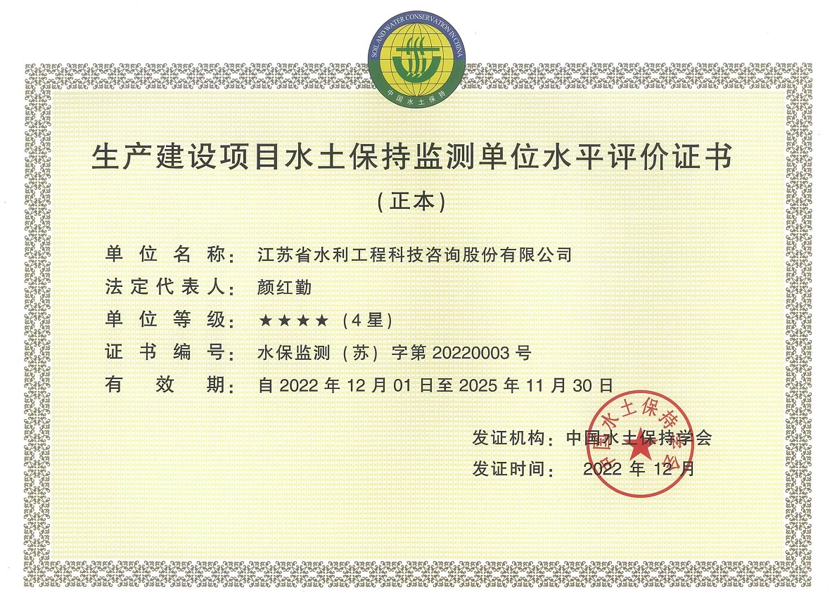 2022年12月,經(jīng)中國(guó)水土保持學(xué)會(huì)評(píng)定,我公司獲得生產(chǎn)建設(shè)項(xiàng)目水土保持方案編制單位水平評(píng)價(jià)四星、生產(chǎn)建設(shè)項(xiàng)目水土保持監(jiān)測(cè)單位水平評(píng)價(jià)四星。